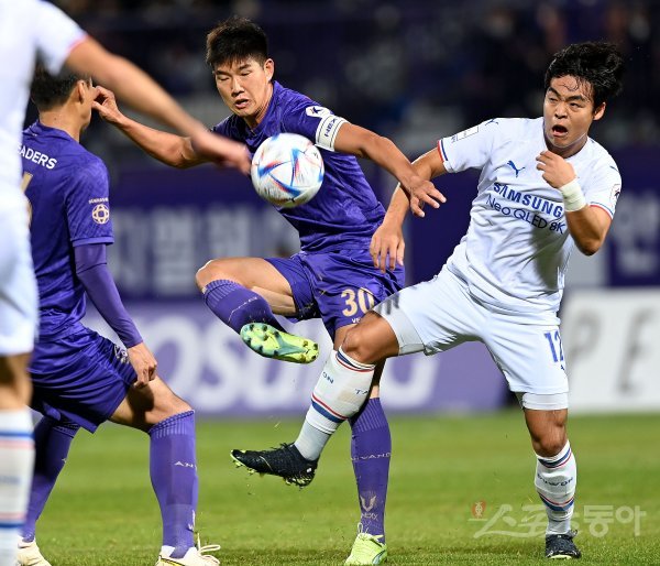 26일 경기도 안양종합운동장에서 열린 ‘하나원큐 K리그 2022’ 수원 삼성과 FC안양의 승강플레이오프 1차전 경기에서 안양 백동규가 수원 강현묵과 볼 다툼을 벌이고 있다.