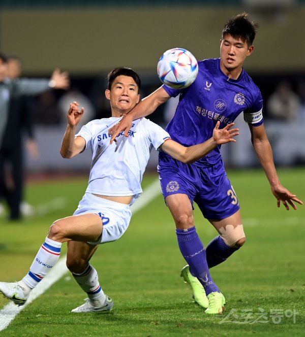 26일 경기도 안양종합운동장에서 열린 ‘하나원큐 K리그 2022’ 수원 삼성과 FC안양의 승강플레이오프 1차전 경기에서 수원 류승우와 안양 백동규가 볼 다툼을 벌이고 있다.
