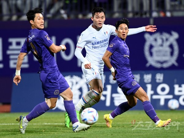 26일 경기도 안양종합운동장에서 열린 ‘하나원큐 K리그 2022’ 수원 삼성과 FC안양의 승강플레이오프 1차전 경기에서 수원 오현규가 안양 수비 사이로 슛을 시도하고 있다.