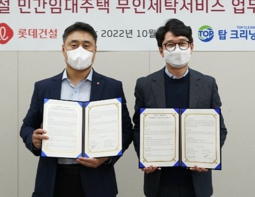 롯데건설이 최근 서울 서초구 잠원동 본사에서 민간임대주택 주거 서비스 활성화 및 입주민 주거 만족도 제고를 위해 클리닝 전문기업 탑크리닝업과 ‘무인세탁서비스 업무협약(MOU)’을 체결했다. 협약식에는 롯데건설 자산운영서비스팀 현재명 수석과 탑크리닝업 최용진 대표가 참석했다.탑크리닝업은 국내 프랜차이즈 세탁전문 부문에서 대한민국 브랜드 만족도 1위를 수상한 클리닝 전문기업이다.