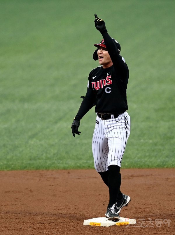 27일 서울 고척스카이돔에서 ‘2022 신한은행 SOL KBO리그’ 키움 히어로즈와 LG 트윈스의 PO 3차전 경기가 열렸다. 2회초 무사에서 LG 오지환이 2루타를 날린 후 환호하고 있다.