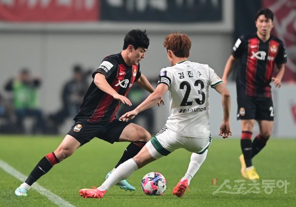 27일 서울월드컵경기장에서 열린 ‘2022 하나원큐 FA컵’ 결승전 1차전 FC서울과 전북 현대의 경기에서 서울 강성진이 전북 수비를 뚫고 드리블 돌파하고 있다.