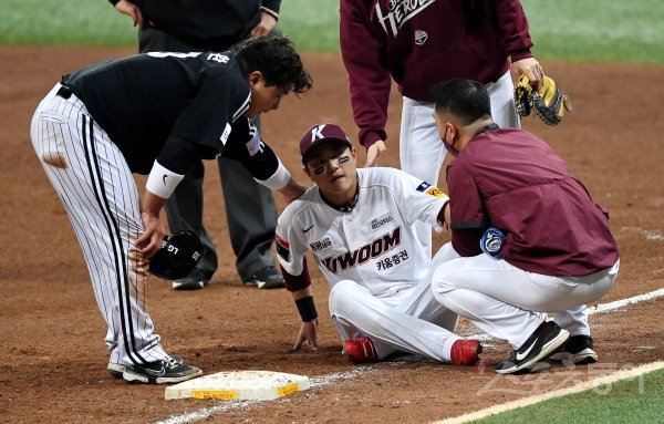 27일 서울 고척스카이돔에서 ‘2022 신한은행 SOL KBO리그’ 키움 히어로즈와 LG 트윈스의 PO 3차전 경기가 열렸다. 5회초 1사 1루에서 플라이 아웃 때 LG 1루 주자 허도환이 귀루하다 키움 김태진과 충돌 후 안부를 묻고 있다.