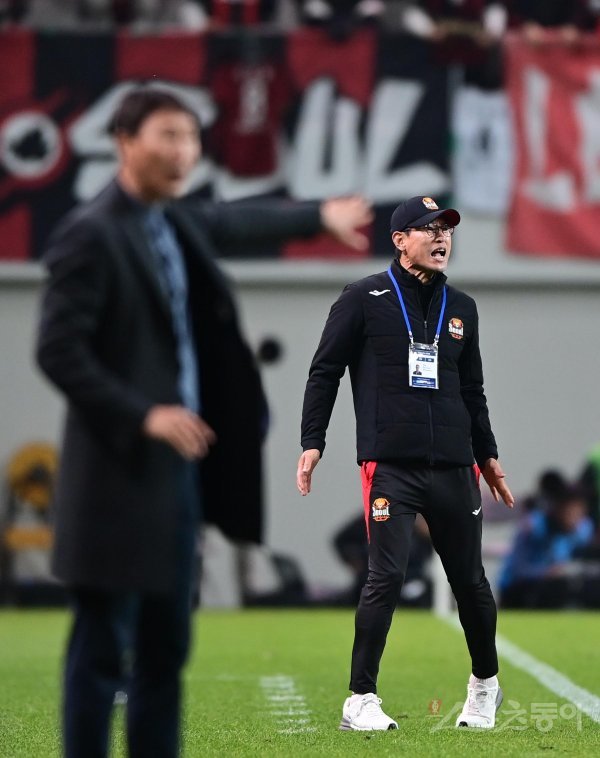 27일 서울월드컵경기장에서 열린 ‘2022 하나원큐 FA컵’ 결승전 1차전 FC서울과 전북 현대의 경기에서 서울 안익수 감독이 선수들에게 작전 지시를 하고 있다.