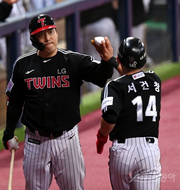 27일 서울 고척스카이돔에서 ‘2022 신한은행 SOL KBO리그’ 키움 히어로즈와 LG 트윈스의 PO 3차전 경기가 열렸다. 7회초 무사 2, 3루에서 내야땅볼 때 LG 김현수가 동점 득점을 올린 서건창을 환영하고 있다.