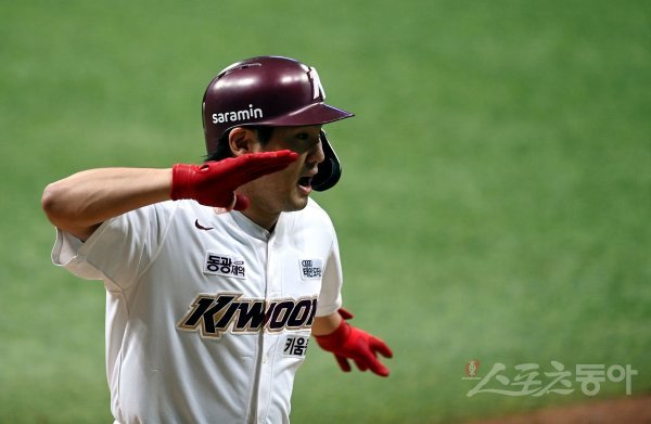 27일 서울 고척스카이돔에서 ‘2022 신한은행 SOL KBO리그’ 키움 히어로즈와 LG 트윈스의 PO 3차전 경기가 열렸다. 7회말 2사 1루에서 키움 대타 임지열이 투런 홈런을 쏘아 올린 후 세리머니를 펼치고 있다.