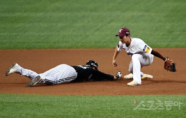 27일 서울 고척스카이돔에서 ‘2022 신한은행 SOL KBO리그’ 키움 히어로즈와 LG 트윈스의 PO 3차전 경기가 열렸다. 8회초 무사 1, 2루에서 번트 아웃 때 키움 김휘집이 2루로 귀루하던 LG 채은성을 태그 아웃시키고 있다.
