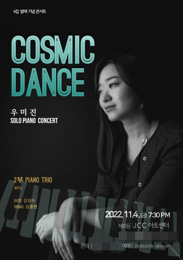 재즈 피아니스트 우미진의 4집 발매 기념 콘서트가 11월 4일(금) 오후 7시 30분 혜화동 JCC아트센터에서 열린다. 콘서트의 타이틀은 4집 앨범과 같은 ‘Cosmic Dance’.