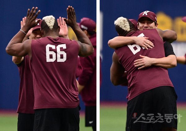 28일 서울 고척스카이돔에서 열린 ‘2022 신한은행 SOL KBO리그’ 플레이오프 4차전 키움 히어로즈와 LG 트윈스의 경기에 앞서 키움 임지열과 푸이그가 포옹을 하고 있다.