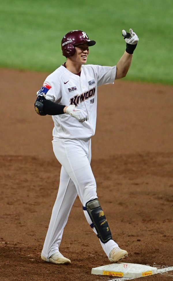 28일 서울 고척스카이돔에서 열린 ‘2022 신한은행 SOL KBO리그’ 플레이오프 4차전 키움 히어로즈와 LG 트윈스의 경기에서 1회말 1사 1, 3루 키움 김혜성이 동점 1타점 좌전 적시타를 친 후 세리머니하고 있다.