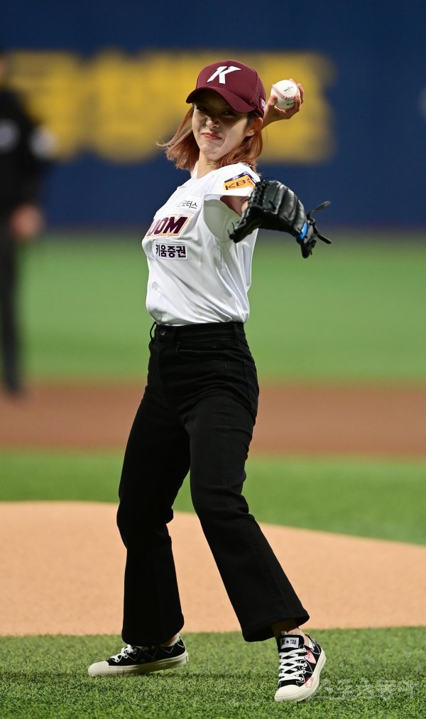 28일 서울 고척스카이돔에서 열린 ‘2022 신한은행 SOL KBO리그’ 플레이오프 4차전 키움 히어로즈와 LG 트윈스의 경기에 앞서 가수 초아가 승리 기원 시구를 하고 있다.