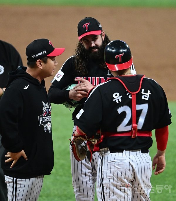 28일 서울 고척스카이돔에서 열린 ‘2022 신한은행 SOL KBO리그’ 플레이오프 4차전 키움 히어로즈와 LG 트윈스의 경기에서 3회말 2사 키움에 역전 솔로 홈런을 허용한 LG 켈리가 포수와 이야기하고 있다.
