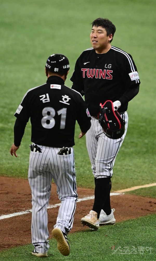 28일 서울 고척스카이돔에서 열린 ‘2022 신한은행 SOL KBO리그’ 플레이오프 4차전 키움 히어로즈와 LG 트윈스의 경기에서 3회초 1사 1루 LG 김현수가 병살타를 친 후 아쉬워하고 있다.