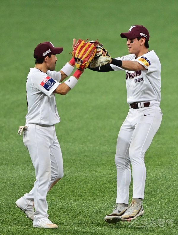 28일 서울 고척스카이돔에서 열린 ‘2022 신한은행 SOL KBO리그’ 플레이오프 4차전 키움 히어로즈와 LG 트윈스의 경기에서 LG에 4-1 승리로 한국시리즈 진출을 확정지은 키움 이용규와 이정후가 기쁨을 나누고 있다.