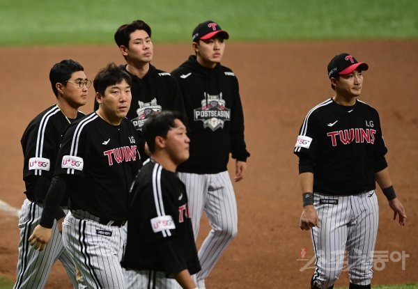 28일 서울 고척스카이돔에서 열린 ‘2022 신한은행 SOL KBO리그’ 플레이오프 4차전 키움 히어로즈와 LG 트윈스의 경기에서 키움에 1-4로 패하며 한국시리즈 진출이 좌절된 LG 선수들이 아쉬워하고 있다.