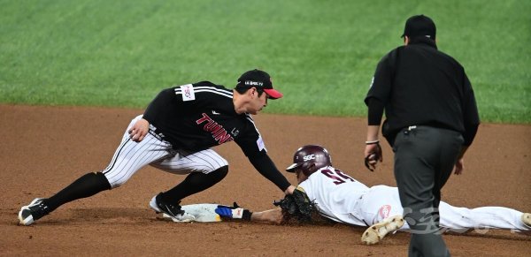 28일 서울 고척스카이돔에서 열린 ‘2022 신한은행 SOL KBO리그’ 플레이오프 4차전 키움 히어로즈와 LG 트윈스의 경기에서 6회말 2사 1루 상황에서 키움 1루주자 이지영이 LG 오지환의 태그에 앞서 도루에 성공하고 있다.