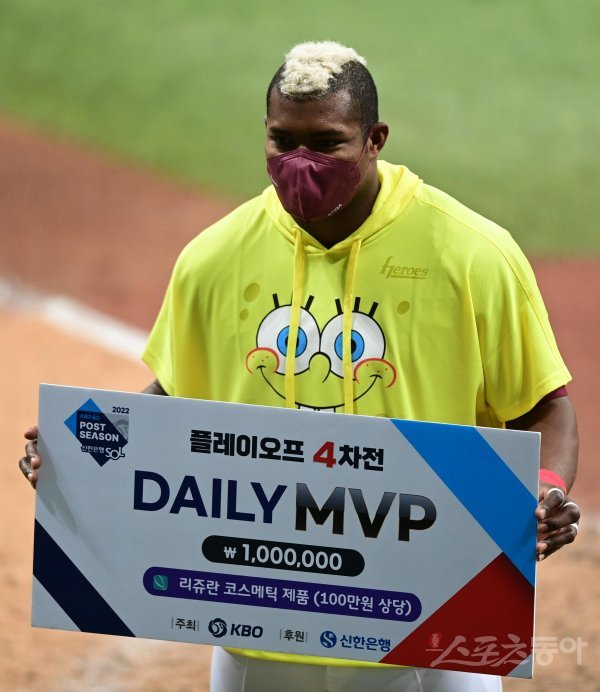 28일 서울 고척스카이돔에서 열린 ‘2022 신한은행 SOL KBO리그’ 플레이오프 4차전 키움 히어로즈와 LG 트윈스의 경기에서 키움 푸이그가 데일리 MVP로 선정돼 포즈를 취하고 있다.