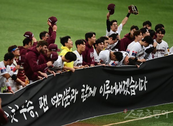 28일 서울 고척스카이돔에서 열린 ‘2022 신한은행 SOL KBO리그’ 플레이오프 4차전 키움 히어로즈와 LG 트윈스의 경기에서 LG에 4-1 승리로 한국시리즈 진출을 확정지은 키움 선수들이 플래카드를 들고 팬들에게 인사하고 있다.