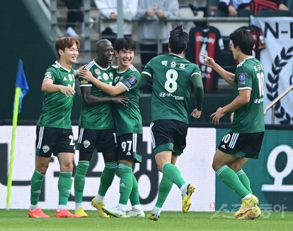 30일 전주월드컵경기장에서 열린 ‘2022 하나원큐 FA컵’ 결승 2차전 전북 현대와 FC서울의 경기에서 전북 바로우가 선제골을 성공시킨 후 동료들과 기쁨을 나누고 있다.