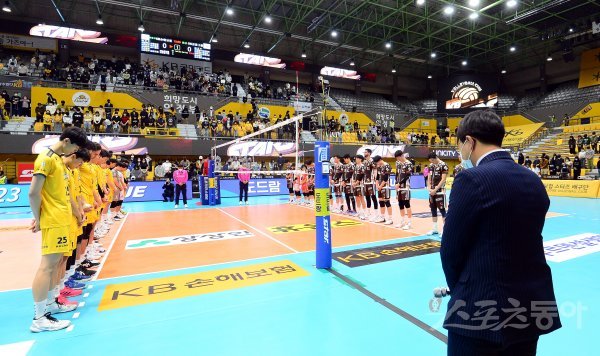 30일 의정부체육관에서 ‘2022~2023 도드람 V-리그’ 남자부 KB손해보험과 OK금융그룹 경기가 열렸다. 양팀 선수들과 관중들이 전날 밤 서울 용산구 이태원동 일대에서 일어난 압사 사고의 희생자을 추모하는 묵념을 하고 있다.