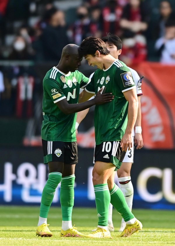 30일 전주월드컵경기장에서 열린 ‘2022 하나원큐 FA컵’ 결승 2차전 전북 현대와 FC서울의 경기에서 전북 조규성이 추가골을 성공시킨 후 바로우와 기쁨을 나누고 있다.