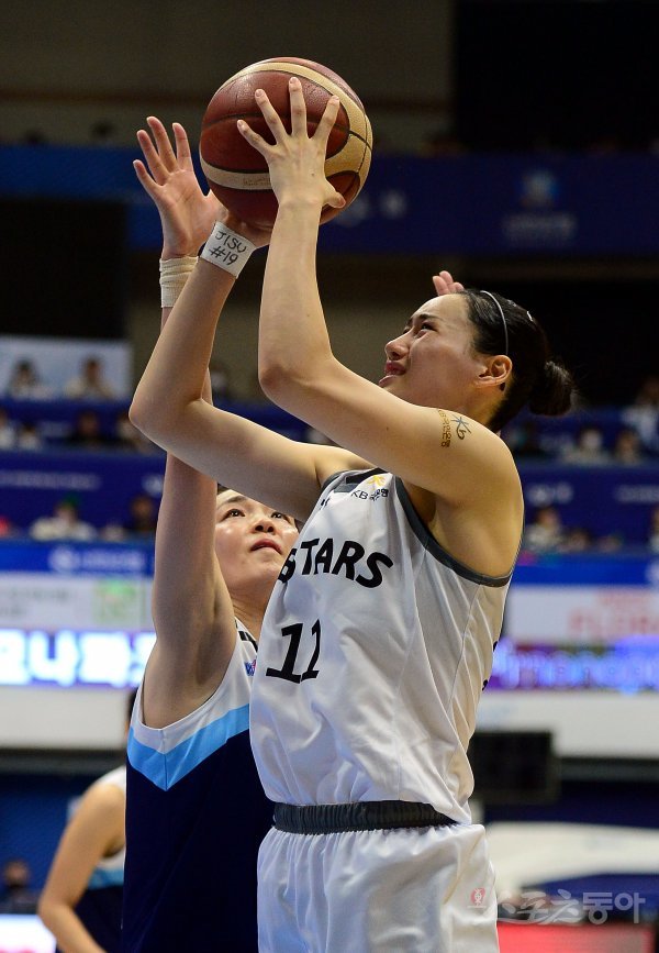30일 인천 도원체육관에서 열린 ‘신한은행 SOL 2022-2022 여자프로농구’ 인천 신한은행과 청주 KB의 경기에서 KB 강이슬이 신한은행 한채진의 수비를 제치며 슛을 쏘고 있다.
