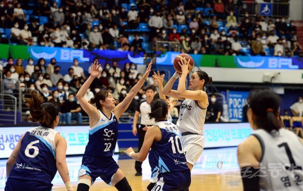 30일 인천 도원체육관에서 열린 ‘신한은행 SOL 2022-2022 여자프로농구’ 인천 신한은행과 청주 KB의 경기에서 KB 강이슬이 신한은행 구슬의 수비를 앞에 두고 슛을 쏘고 있다.