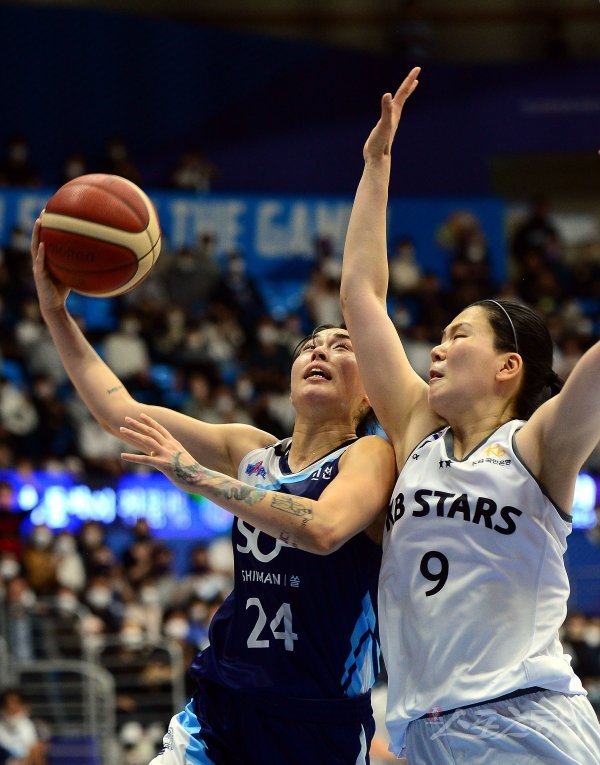30일 인천 도원체육관에서 열린 ‘신한은행 SOL 2022-2022 여자프로농구’ 인천 신한은행과 청주 KB의 경기에서 신한은행 김소니아가 KB 김소담의 수비를 피해 슛을 쏘고 있다.