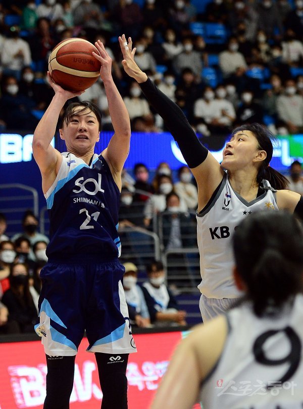 30일 인천 도원체육관에서 열린 ‘신한은행 SOL 2022-2022 여자프로농구’ 인천 신한은행과 청주 KB의 경기에서 신한은행 김진영이 KB 수비를 피헤 슛을 쏘고 있다.