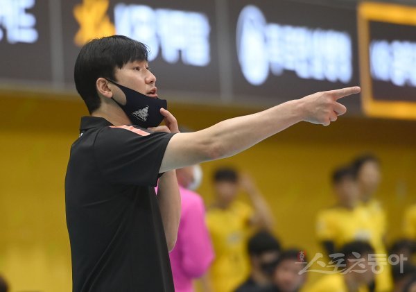 30일 의정부체육관에서 열린 ‘2022~2023 도드람 V-리그’ 남자부 KB손해보험과 OK금융그룹 경기에서 OK금융그룹 석진욱 감독이 작전 지실르 하고 있다.