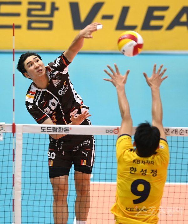 30일 의정부체육관에서 열린 ‘2022~2023 도드람 V-리그’ 남자부 KB손해보험과 OK금융그룹 경기에서 OK금융그룹 신호진이 KB손해보험의 블로킹 사이로 스파이크를 날리고 있다.