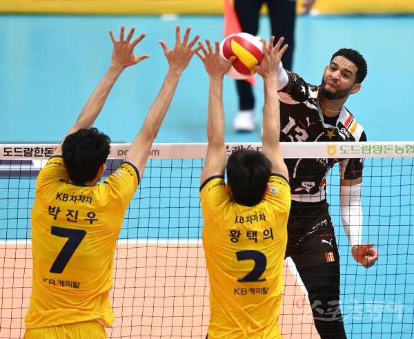 30일 의정부체육관에서 열린 ‘2022~2023 도드람 V-리그’ 남자부 KB손해보험과 OK금융그룹 경기에서 OK금융그룹 레오가 KB손해보험의 블로킹 사이로 스파이크를 날리고 있다.