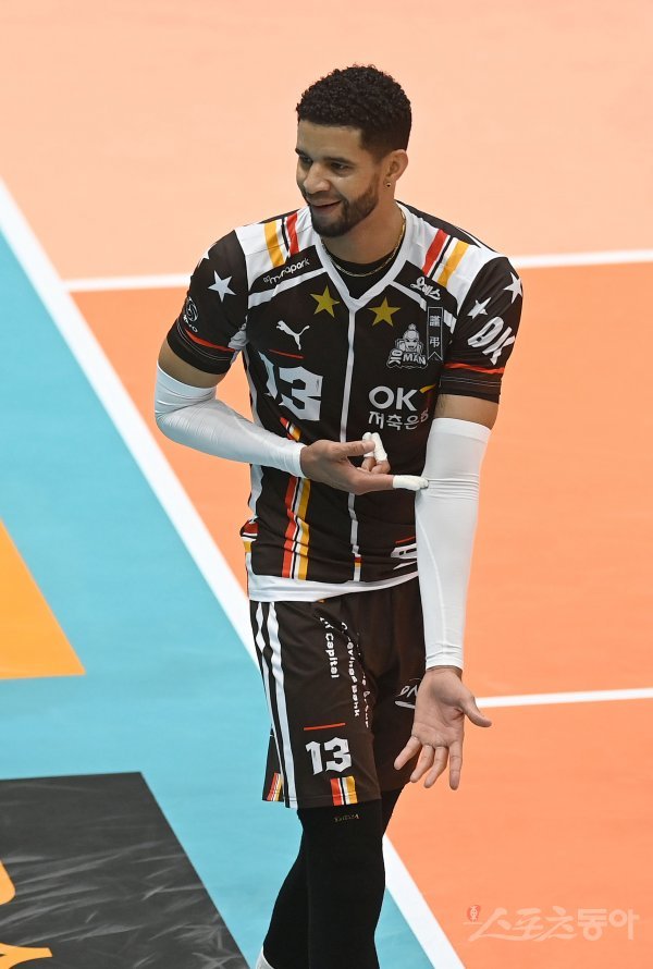 30일 의정부체육관에서 열린 ‘2022~2023 도드람 V-리그’ 남자부 KB손해보험과 OK금융그룹 경기에서 OK금융그룹 레오가 블로킹 득점에 성공한 후 기뻐하고 있다.