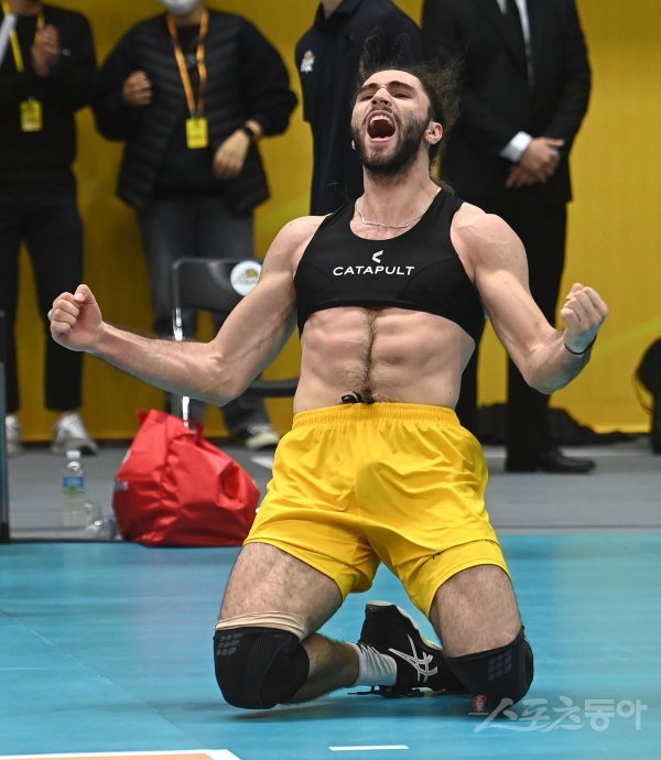 30일 의정부체육관에서 열린 ‘2022~2023 도드람 V-리그’ 남자부 KB손해보험과 OK금융그룹 경기에서 KB손해보험 니콜라가 5세트 승리를 확정짓는 득점에 성공한 후 기뻐하고 있다.