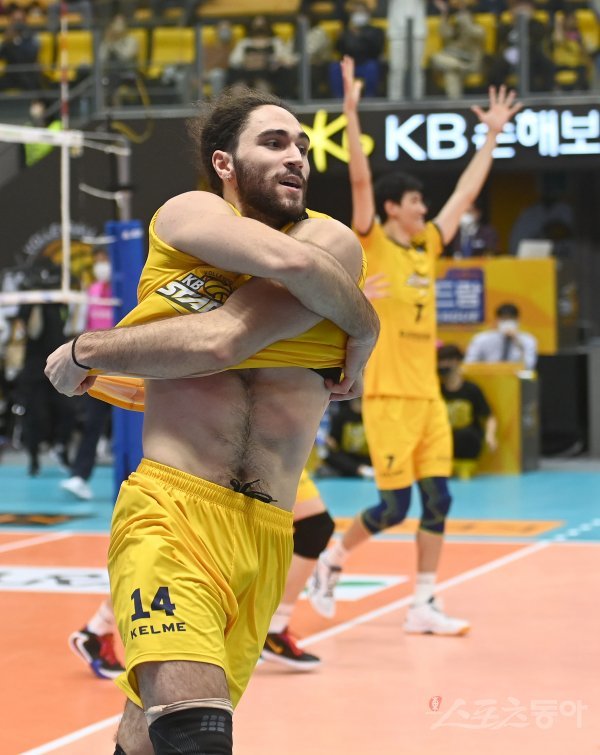 30일 의정부체육관에서 열린 ‘2022~2023 도드람 V-리그’ 남자부 KB손해보험과 OK금융그룹 경기에서 KB손해보험 니콜라가 5세트 승리를 확정짓는 득점에 성공한 후 기뻐하고 있다.