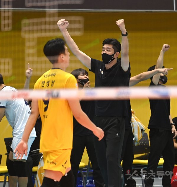 30일 의정부체육관에서 열린 ‘2022~2023 도드람 V-리그’ 남자부 KB손해보험과 OK금융그룹 경기에서 KB손해보험 후인정 감독이 팀 득점에 기뻐하고 있다.