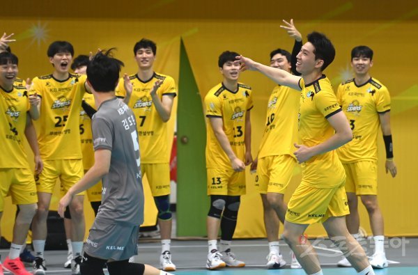 30일 의정부체육관에서 열린 ‘2022~2023 도드람 V-리그’ 남자부 KB손해보험과 OK금융그룹 경기에서 KB손해보험 황택의가 연속 서브 득점에 성공한 후 기뻐하고 있다.