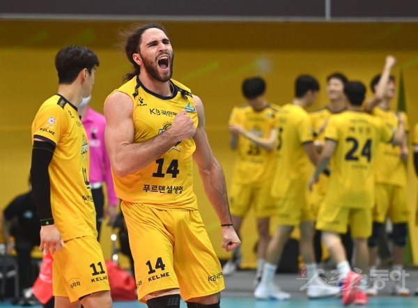 30일 의정부체육관에서 열린 ‘2022~2023 도드람 V-리그’ 남자부 KB손해보험과 OK금융그룹 경기에서 KB손해보험 니콜라가 공격 득점에 성공한 후 기뻐하고 있다.