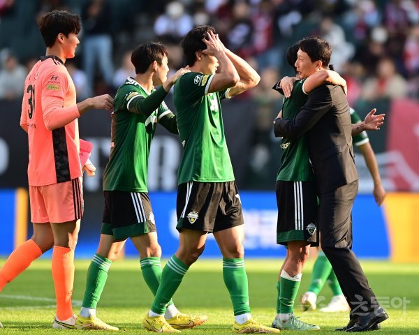 30일 전주월드컵경기장에서 열린 ‘2022 하나원큐 FA컵’ 결승 2차전 전북 현대와 FC서울의 경기에서 3-1로 승리하며 통산 5번째 우승을 차지한 전북 김상식 감독이 선수들과 기쁨을 나누고 있다.