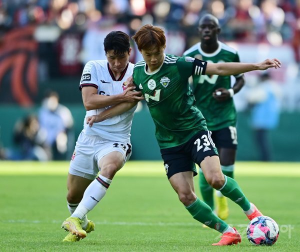 30일 전주월드컵경기장에서 열린 ‘2022 하나원큐 FA컵’ 결승 2차전 전북 현대와 FC서울의 경기에서 서울 윤종규와 전북 김진수가 몸싸움을 하고 있다.