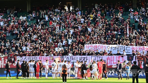 30일 전주월드컵경기장에서 열린 ‘2022 하나원큐 FA컵’ 결승 2차전 전북 현대와 FC서울의 경기에서 1-3으로 패하며 우승을 놓친 서울 선수들이 팬들에게 인사하고 있다.