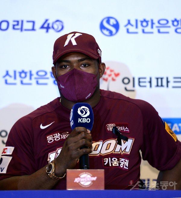 31일 인천 문학종합경기장 그랜드오스티엄에서 ‘2022 신한은행 SOL KBO리그’ SSG 랜더스와 키움 히어로즈의 한국시리즈 미디어데이가 열렸다. 키움 푸이그가 출사표를 밝히고 있다.