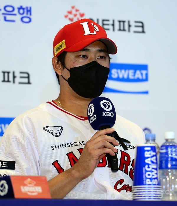 31일 인천 문학종합경기장 그랜드오스티엄에서 ‘2022 신한은행 SOL KBO리그’ SSG 랜더스와 키움 히어로즈의 한국시리즈 미디어데이가 열렸다. SSG 한유섬이 출사표를 밝히고 있다.