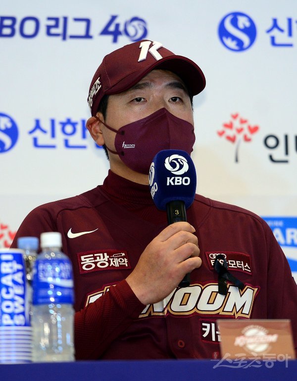 31일 인천 문학종합경기장 그랜드오스티엄에서 ‘2022 신한은행 SOL KBO리그’ SSG 랜더스와 키움 히어로즈의 한국시리즈 미디어데이가 열렸다. 키움 홍원기 감독이 출사표를 밝히고 있다.