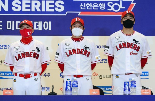 31일 인천 문학종합경기장 그랜드오스티엄에서 ‘2022 신한은행 SOL KBO리그’ SSG 랜더스와 키움 히어로즈의 한국시리즈 미디어데이가 열렸다. SSG 김원형 감독, 최정, 한유섬이 포즈를 취하고 있다.