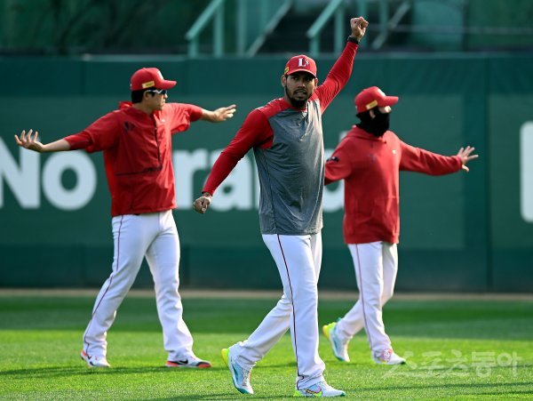 1일 인천 SSG 랜더스필드에서 ‘2022 신한은행 SOL KBO리그’ SSG 랜더스와 키움 히어로즈의 한국시리즈 1차전 경기가 열린다. 경기 전 SSG 폰트가 스트레칭 훈련을 하고 있다.