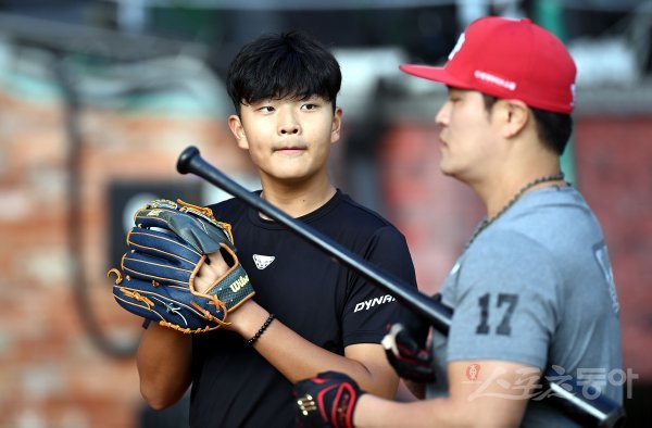 1일 인천 SSG 랜더스필드에서 ‘2022 신한은행 SOL KBO리그’ SSG 랜더스와 키움 히어로즈의 한국시리즈 1차전 경기가 열린다. 경기 전 SSG 추신수 아들 추건우 군이 아버지를 바라보고 있다.