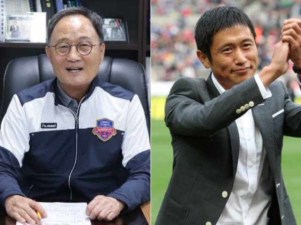 수원FC 김호곤 단장(왼쪽), 강원FC 이영표 대표이사. 사진 | 스포츠동아DB, 수원FC