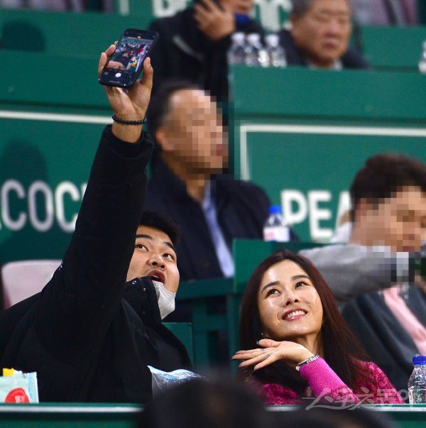 1일 인천 SSG랜더스필드에서 ‘2022 신한은행 MY CAR KBO리그’ 한국시리즈 1차전 키움 히어로즈와 SSG 랜더스 경기가 열렸다. SSG 추신수의 아내 하원미와 아들 추무빈이 셀카를 찍고 있다.