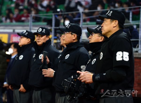 1일 인천 SSG 랜더스필드에서 ‘2022 신한은행 SOL KBO리그’ SSG 랜더스와 키움 히어로즈의 한국시리즈 1차전 경기가 열렸다. 경기에 앞서 심판들이 이태원 사고를 추모하는 검은 리본을 모자에 달고 경기에 나서고 있다. 인천 | 김민성 기자 marineboy@donga.com